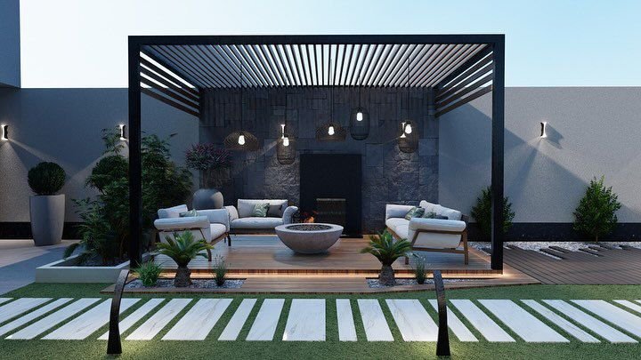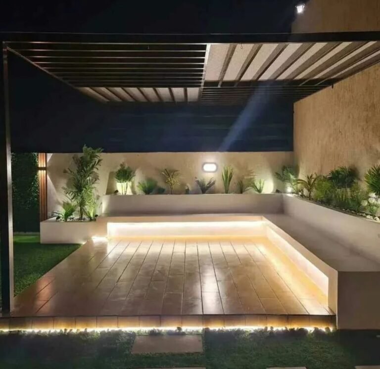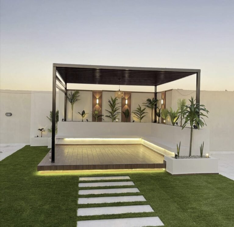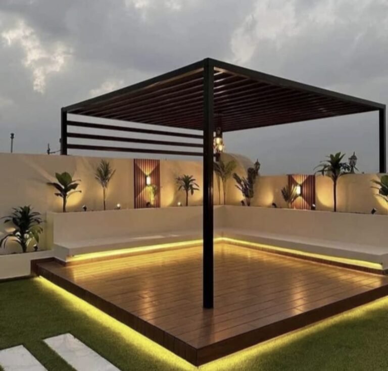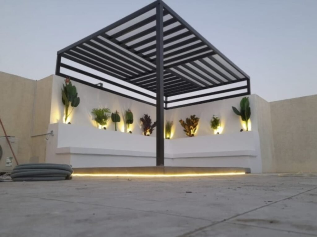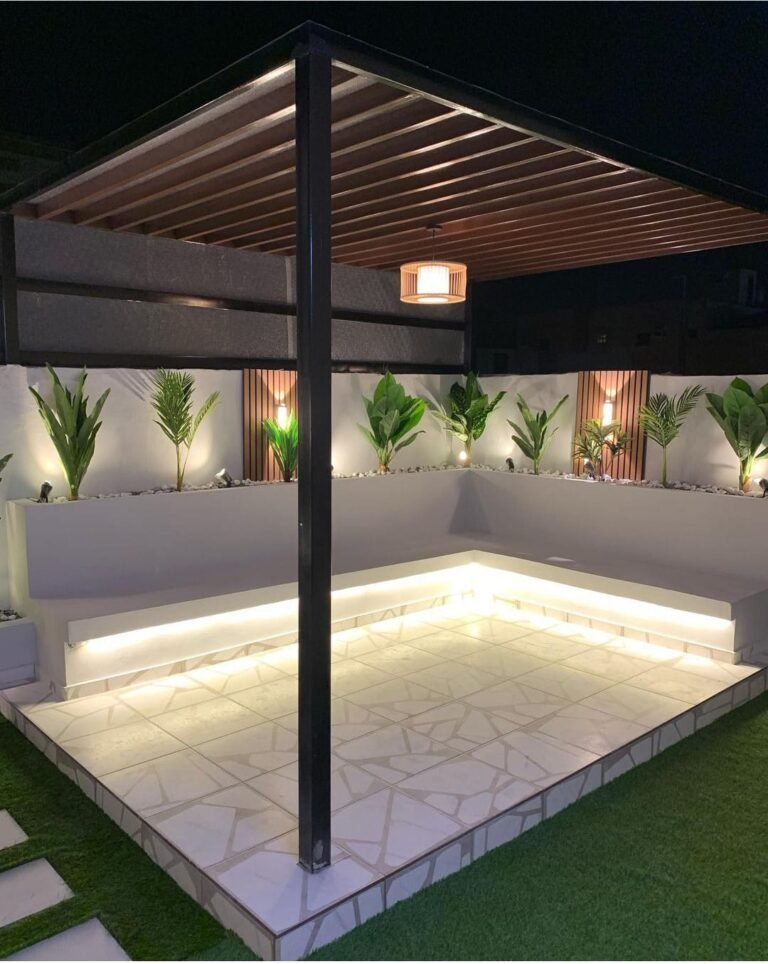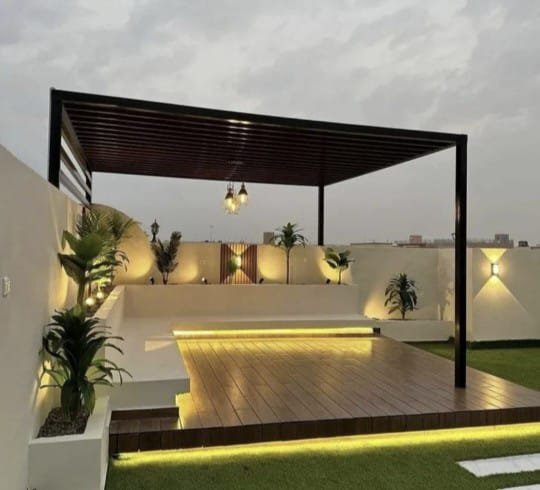 نضيف حلول إضاءة مدروسة داخل المظلات والبرجولات لإبراز جمال التصميم ليلًا، وخلق أجواء مريحة تناسب الجلسات المسائية.